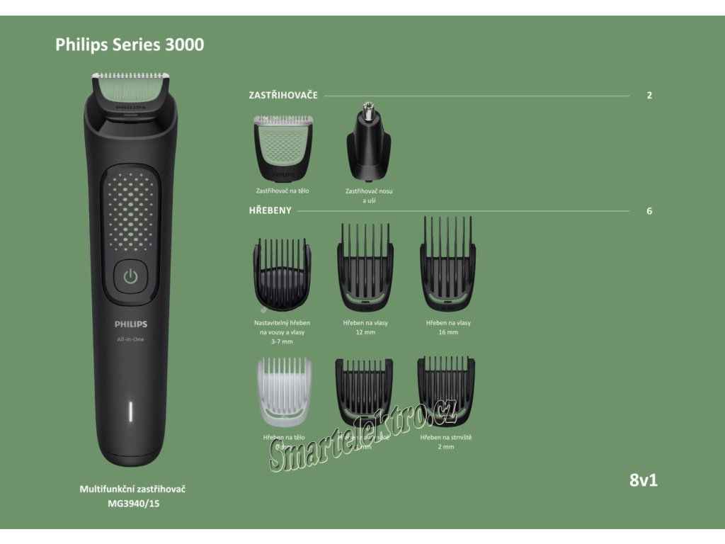 Philips MG3940/15 Series 3000 8v1 – multifunkční zastřihovačMultifunkční zastřihovač Philips MG3940/15 Series 3000 je všestranné zařízení pro kompletní péči o vousy, vlasy i tělo. Díky 7 výměnným nástavců zvládne úpravy vousů, zastřihování vlasů, detailní konturování, úpravu uší a nosu i zastřihování tělesného ochlupení. Zařízení je vybaveno samoostřicími celokovými břity, které zajišťují dlouhodobou ostrost a spolehlivý výkon. Zastřihovač nabízí možnost suchého i mokrého použití, což umožňuje holení pod sprchou nebo s pěnou. Ergonomický tvar zajišťuje pohodlné držení a přesnou kontrolu během používání. Díky akumulátorovému napájení poskytuje až 70 minut provozu na jedno nabití, což je dostatečné pro několik úprav. Hlavní vlastnosti a funkce