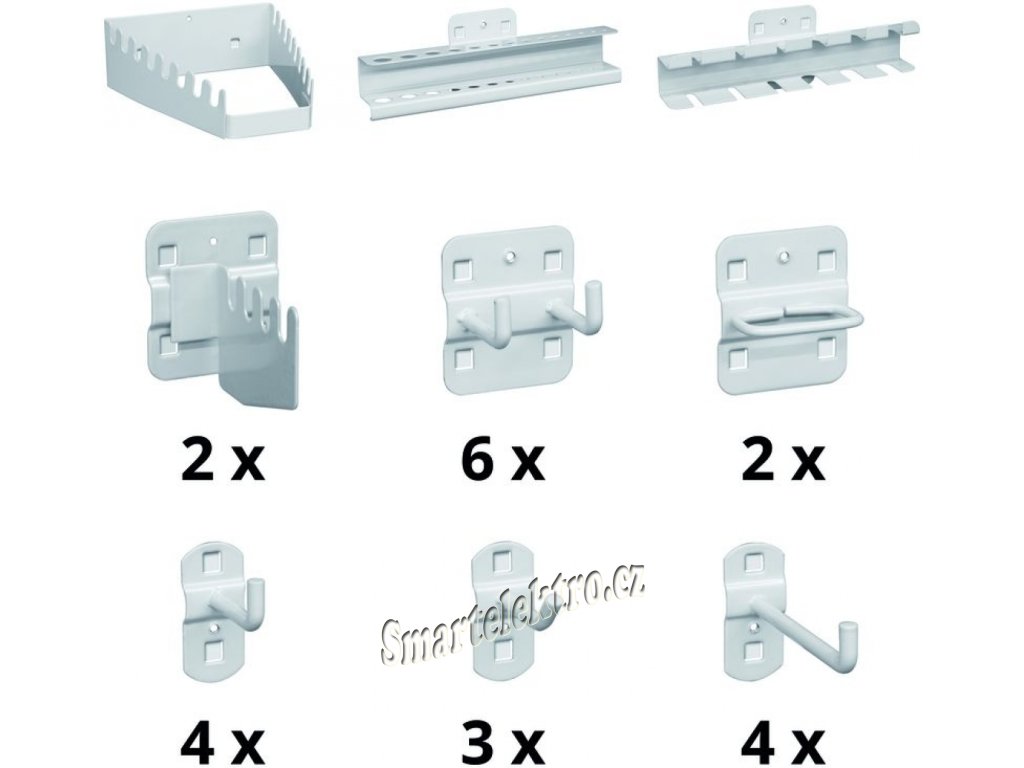 Sada 28 háků a držáků, kompatibilní s dílenskými závěsnými systémy, které využívají čtvercové děrování 10 mm2 při vertikální/horizontální vzdálenosti středů otvorů 38 mm. Vybavení: závěsné háky šikmé/pravoúhlé (14), dvojité závěsné háky (6), závěsné držáky na vrtáky/šroubováky/montážní klíče/pily/kleště (1).