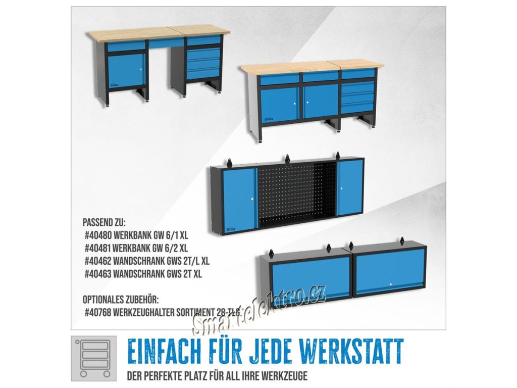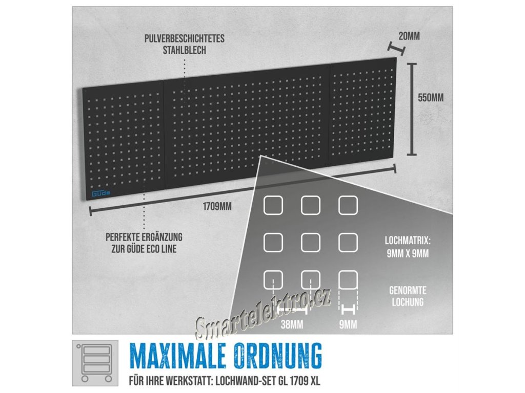 | Tato 3dílná perforovaná stěna XL je dokonalým doplňkem řady Güde Eco Line, díky kterému lze nyní optimálně využít i prostor na stěně nad našimi dvěma pracovními stoly XL. - praktické třídílné provedení, lze montovat i jednotlivě - jednotlivé rozměry panelů: 1 x (909 x 550 x 20) | 2 x (400 x 550 x 20) mm - ideální v kombinaci s odpovídající nástěnnou skříňkou - standardizovaná perforace: čtvercová, 9 x 9 mm, vzdálenost středů otvorů 38 mm - práškově lakovaný ocelový plech vhodné pro: - 40480 Pracovní stůl GW 6/1 XL - 40481 Pracovní stůl GW 6/2 XL - 40462 Nástěnná skříňka GWS 2T/L XL - 40463 Nástěnná skříňka GWS 2T XL volitelné příslušenství: - 40768 Sada držáků nářadí 28 ks. Všechny držáky nástrojů a háčky jsou vhodné pro děrované stěny a systémy Güde se čtvercovým otvorem 8x8 - 10x10 mm a osovou vzdáleností otvorů 38 mm. |