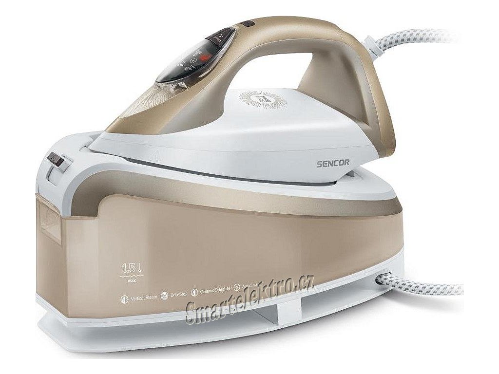 Napařovací žehlička Sencor SSI 8310GD s keramickou žehlící plochou, Příkon 3200 W, parní ráz 195g/minutu, nádržka na vodu o objemu 350ml, čistící systém Self-cleaning, systém...
